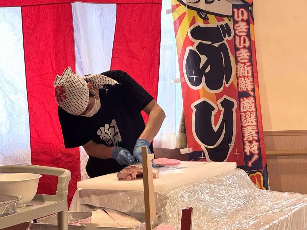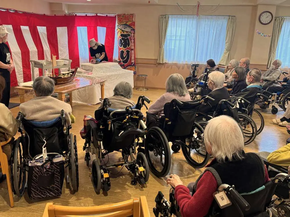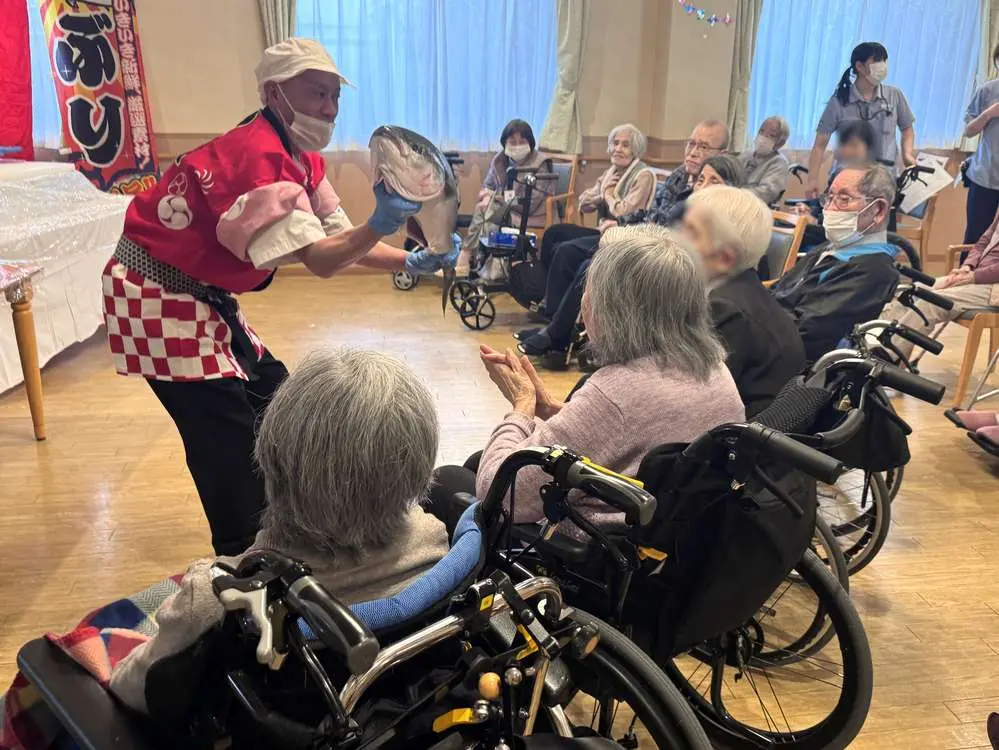 八千代村上でぶりの解体ショーを行うのは初めてだったので、ご入居者様も職員もとても楽しみにしていました😆