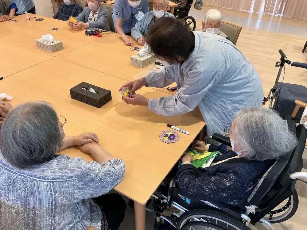 カラフルな紙を広げるところから始まり、折ったり、糊で貼り合わせたりと、一つひとつの工程に集中しながら取り組まれる姿がみられました😊