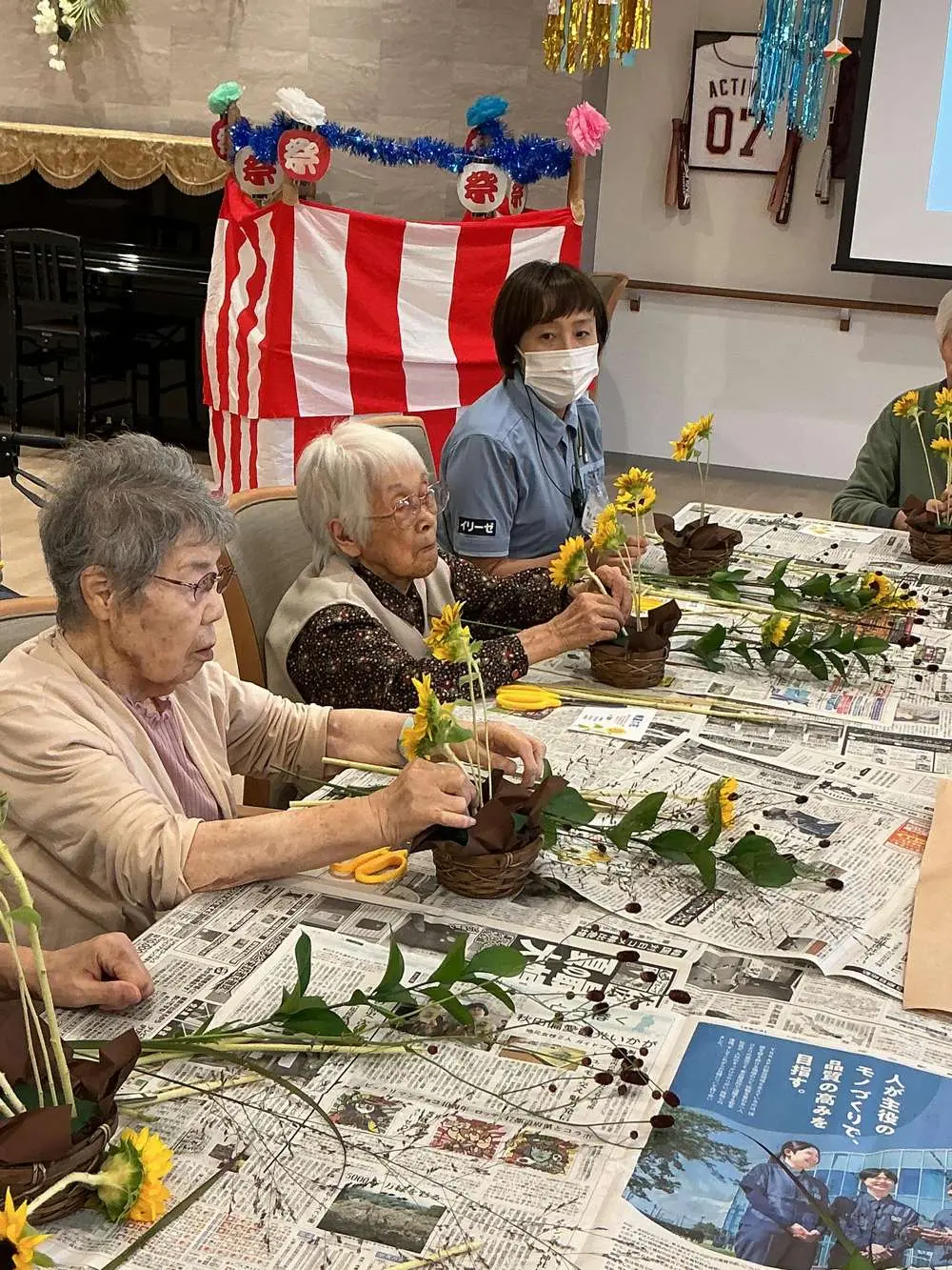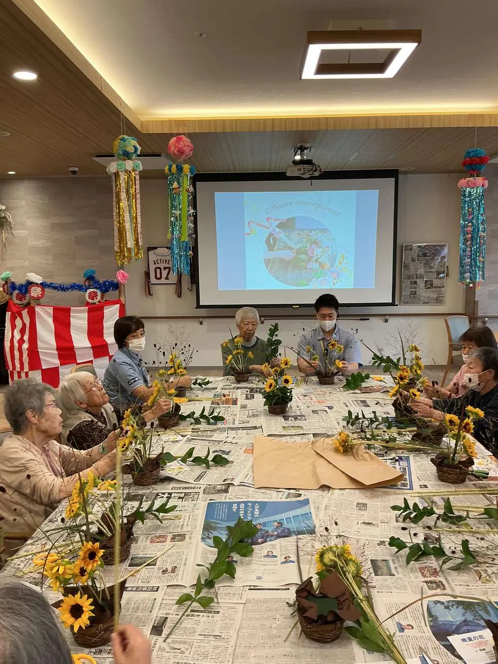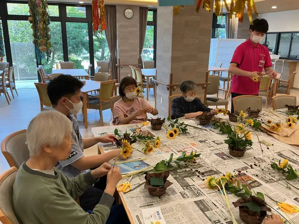 ひまわりをメインとし全体が明るく感じられ自分でアレンジした花を眺めると、まるで小さな庭を作ったような気持ちになり花の形や色の組み合わせを考えるのが楽しく、入居者様方時間を忘れて夢中になって取り組んでおりました😁