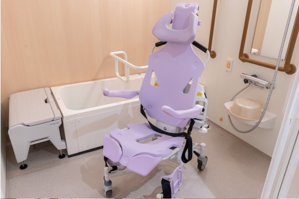 - 足腰が不自由な方も、機械浴室で入浴が可能です。専用のいすに座ったまま髪や身体を洗え、リクライニング調整でお身体に合わせた入浴が可能です。